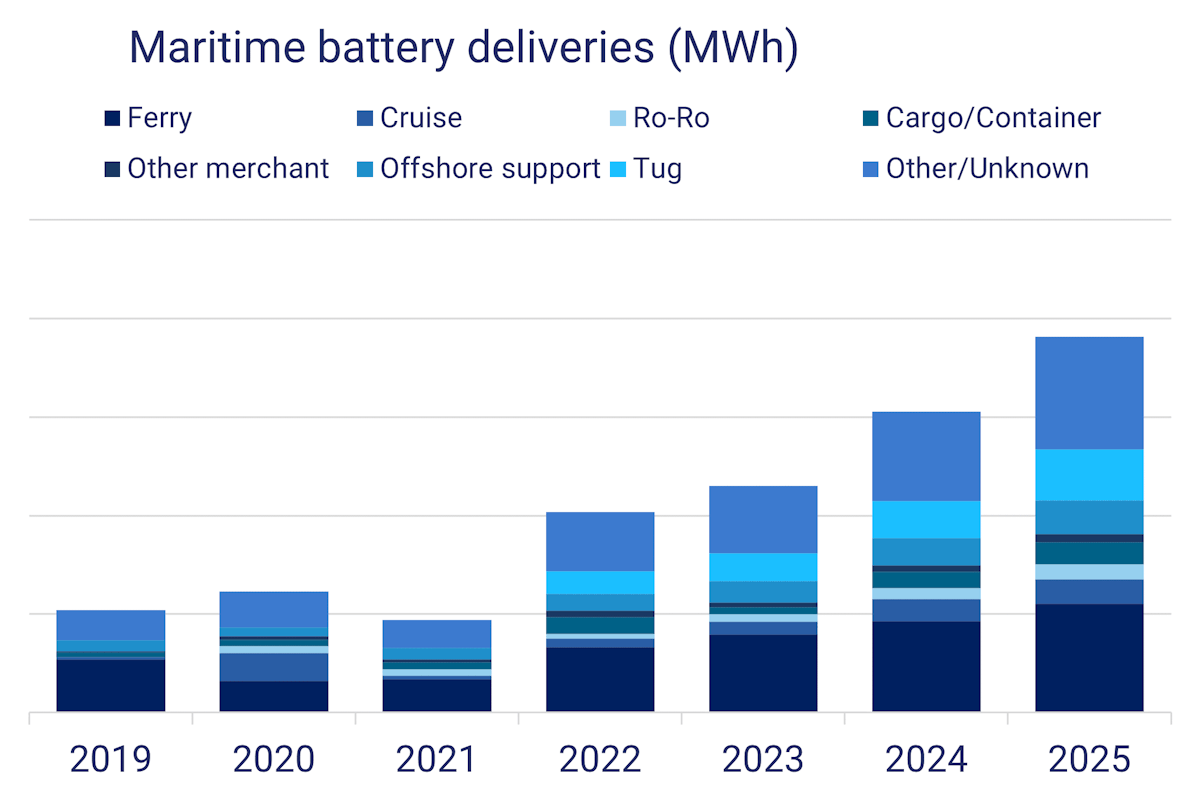 1.4.Marine battery market history 2019 - 2025 by subsector: ferry, cruise, ro-ro, cargo, OSV, tug, other